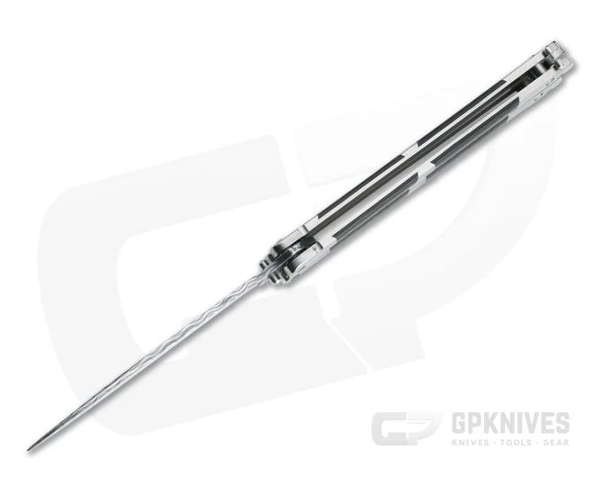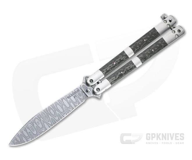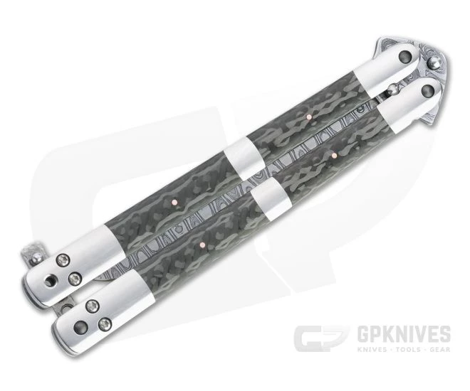 This custom balisong from maker Craig Camerer is a stunner! You can feel the craftsmanship and hard work Craig put into this piece as soon as you pick it up. This piece comes with a custom drip pattern carbon Damascus spear point blade, titanium handles and split Shatter Weave carbon fiber inlays with copper pins.