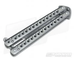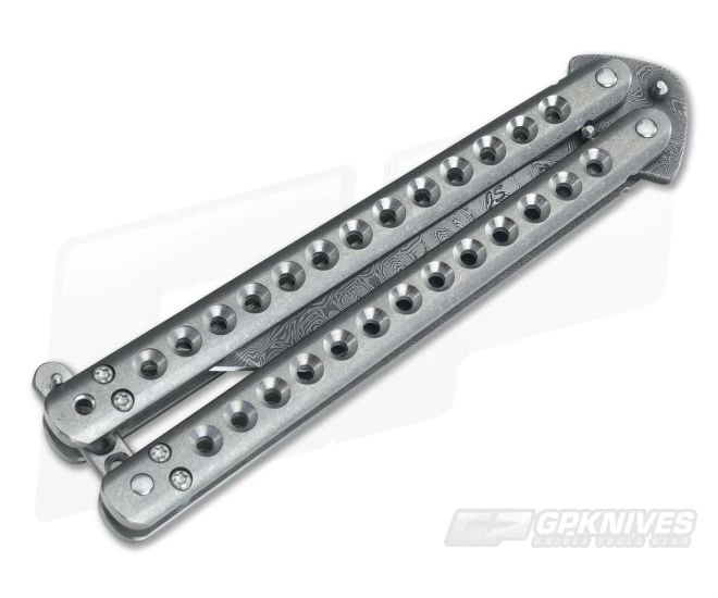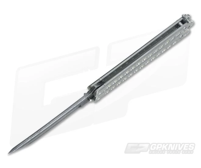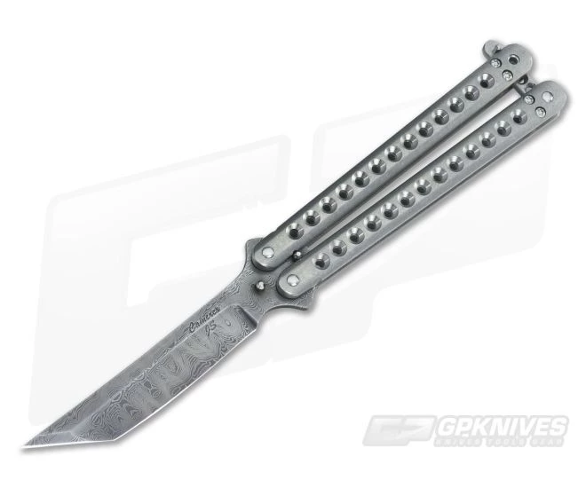 The quality of this Camerer Custom Balisong is something to behold! Tumbled and milled titanium handles contrast beautifully with the compound ground damascus blade that sports a hollow ground edge and saber ground, Tanto point. The knife balances nicely in the hand and cycles smoothly.
