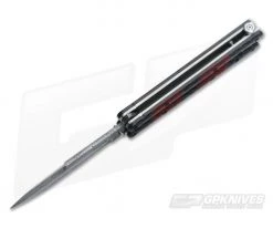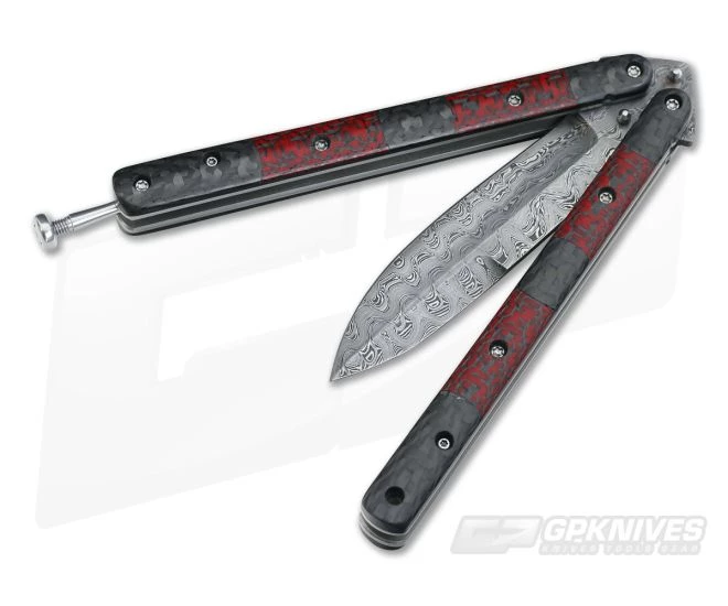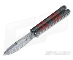 This custom El Diablo balisong from maker Craig Camerer is hot! You can feel the craftsmanship and hard work Craig put into this piece as soon as you pick it up. Its spear blade is Damascus forged by Craig himself paired with some fiery red/black carbon fiber. Wow!