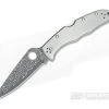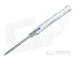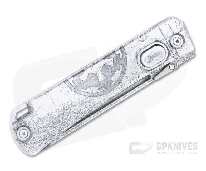 Handle: Two slabs of solid zirconium form the streamlined handle, finished with custom distressed “Stormtrooper” art work from Brent of Black Widow Knives. Inside are two steel liners, one is the lock, the other attaches to the button. The combination provides a safe, secure and easy to operate locking mechanism. A milled hole at the back allows for lanyard attachment with white coated hardware and back spacer completing the construction. Includes padded hard plastic case.