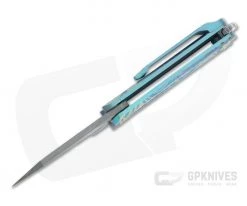 Handle: Contoured channel milled titanium slabs form the handles offering a solid secure three-finger grip and good balance in operation. Custom anodization delivers a striking visual appeal that complements the Damascus blade on this unique custom piece. This version included a matching anodized 3D pocket clip that allows for sight-free indexing of the safe handle and secure pocket carry. Satin hardware and custom stainless steel t-latch complete the construction.