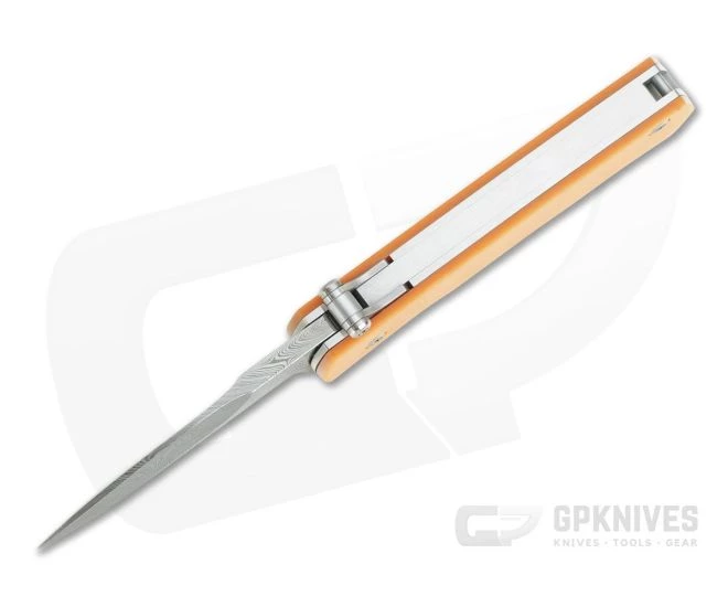 Designed by Stan Moizis, creator of the ‘Paw Claw’ mechanism, the D Rocket Design Shamsher is sleek, ambidextrous California legal automatic knife with a unique lever deployment. The sub-2 inch blade has a utilitarian, spear-like drop point blade that is perfect for your everyday tasks while delivering a nice visual appeal with the large top swedge. This version comes with a Damasteel blade and Orange Paper Micarta handle scales.
