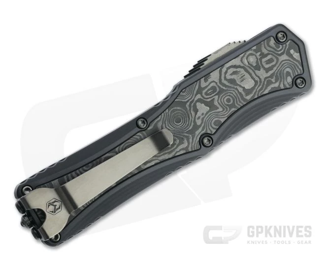 The Heretic Knives Colossus is a tactically inspired double action, out-the-front automatic that comes in just under the length of the Manticore-X for easy carry while offering a more heavy-duty construction. This custom version has a hand ground Bakers Forge San Mai Damascus dagger blade, black anodized aluminum handle, “Black Dunes” Fat Carbon inlays and black DLC coated hardware. S/N 041