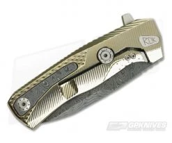 Handle: The integral construction is built from a single piece of billet Gold Anodized Titanium milled using precision 4-axis machining. A combination of grooved and diamond texturing and milled contours delivers an excellent balance of comfort and traction in the hand. The ROK built with a steel insert equipped, integral frame lock mechanism with the added security of the Rotoblock system. The Rotoblock acts as a lock bar stabilizer and when engaged will completely block or lock the lock bar in the engaged position delivering “fixed blade like” reliability. The innovative, spring loaded H.WAYL clip automatically retracts into the handle when not in use for added comfort but is ready for secure carry with a slide of the button.