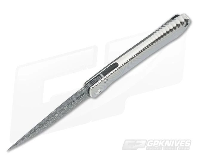 Designed by DPx Gear founder Robert Young Pelton and built to perfection by the crew at LionSteel, the TS-1 TiSpine takes the gentleman’s folder to a whole new level. The integral handle is CNC milled from a single block of aerospace grade titanium alloy and given a polished Shine Grey finish. The sleek, lightweight design is extremely durable and features a sturdy frame locking system. Gorgeous lizard pattern Damascus Inox by Chad Nichols has been made into a clip point blade with a rectangular thumb hole for easy deployment. Includes a tip-up deep carry stainless steel pocket clip. Direct from LionSteel Knives.