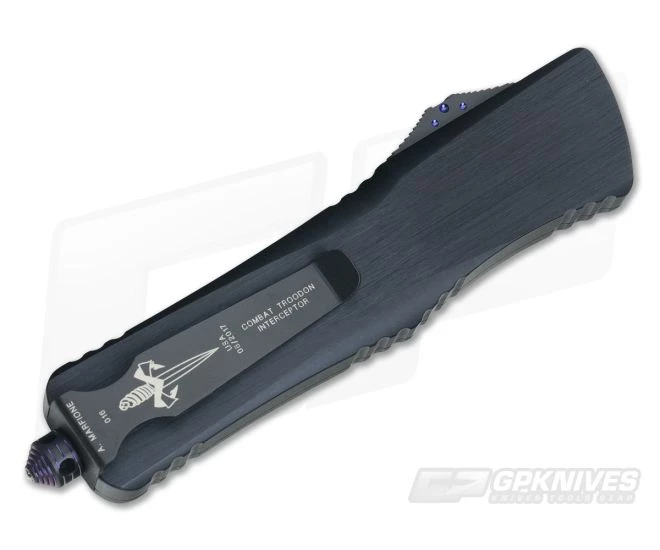 The Handle: Fully hefted anodized alloy offers 5.25 inches of handle, excluding the breaker, substantial enough for even the largest or gloved hands. It has a smooth, brushed satin look and feel with machined grooves perfectly placed on both outer sides. It is built with Microtech’s proprietary Purple ringed Titanium hardware, integrated glass breaker end and black pocket clip. The clip features the Customs dagger, USA 08/2017, model with maker and Serial #016.