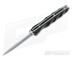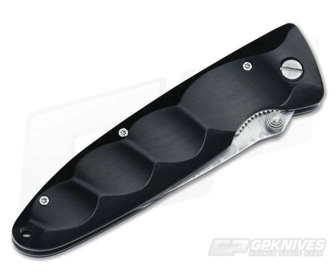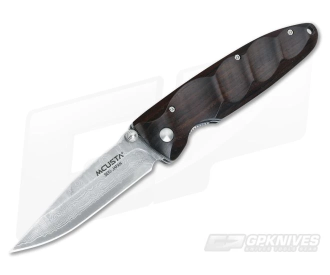 MCusta Basic Series with plain edge 33-layer nickel damascus steel blade with VG-10 core. African ebony wood handle with contoured finger grooves. Teflon washer system. Dual thumb studs and stainless steel liners. Black nylon belt pouch.