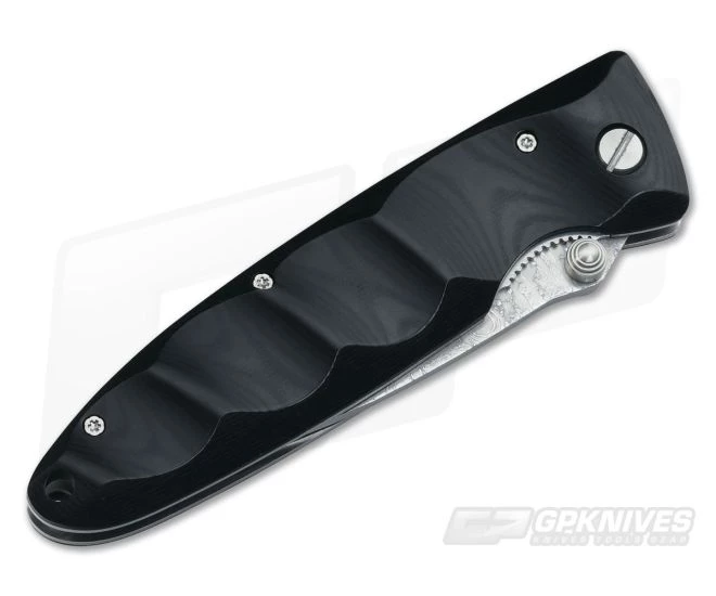 MCusta Basic Series Folder with plain edge damascus blade and handsome Black Micarta handles. The artfully crafted plain edge blade is 33 layer nickel damascus with a strong VG-10 stainless steel core for cutting power. Dual thumb studs and a Teflon washer system assist in silky smooth opening of the blade. When in the open position, the blade is held solidly in place by a stainless steel liner lock mechanism. Contoured finger grooves have been added to the smooth black micarta handle which are attached to the dual stainless liners. Includes a black nylon velcro pouch with MCusta logo stitched leather patch.