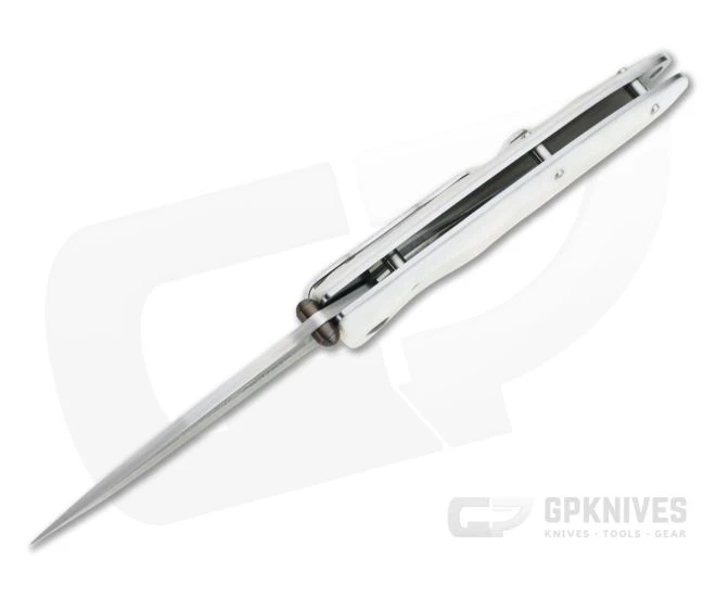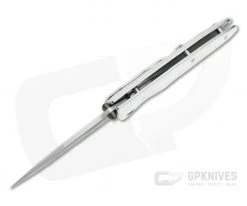 Handle: The exposed stainless steel liners are seamless and smooth creating the foundation for the satin finished Corian handle scales. Corian is a smooth, durable and stain resistant material often used in counter tops and makes a functional and striking handle material with the satin finish highlighting the unique texture of the material. The grooved milling of the “Classic Wave” scales provides added traction while the clean contours of the handle are ergonomic and comfortable. A liner lock mechanism provides reliable lockup and smooth operation.