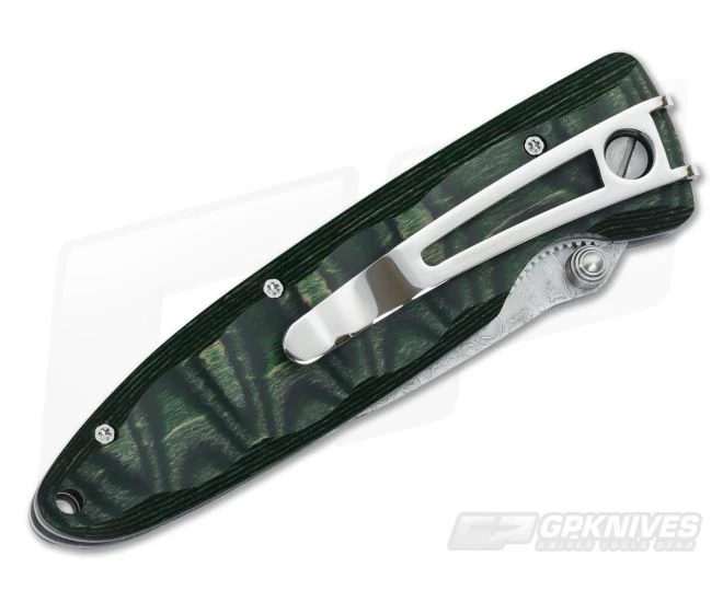 MCusta Damascus Basic Series Folder featuring a plain edge 33-layer nickel damascus with VG-10 stainless steel core blade. Green micarta handle with contoured finger grooves. Teflon washer system for silky smooth operation. Dual thumb studs and stainless steel liners, one forming the lock. Includes stainless steel pocket clip affixed for tip-down right-handed carry.