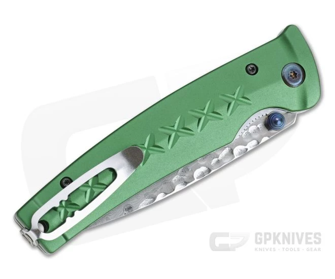 The Fusion folders from MCusta blend the historical lines of the Japanese samurai sword with Mcusta’s passion for precision manufacturing and contemporary design. Inspired by the classic katana, the Fusion has elegant lines with a clean tactical look and ergonomic feel. This version features green anodized aluminum handle scales and a San Mai Damascus blade.