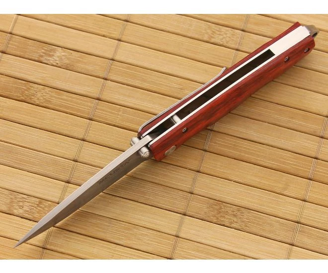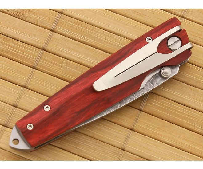 Handsome MCusta Gentleman’s Folder dressed in staminawood and damscus/VG-10 blade. Contoured staminawood handles scales have been attached over brushed stainless steel liners helping to give the knife its classy look as well as comfortable feel. Housed between the stainless liners, one locking, is a 33 layer nickel damascus sandwich style blade with VG-10 core for cutting power and edge retention. Dual thumb studs and a teflon washer system allow for smooth opening. To finish the piece, you will find a lanyard hole that protrudes from the end of the handle as well as a deep carry tip-down stainless steel pocket clip.