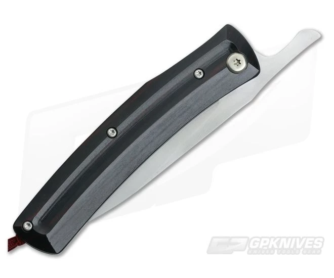 Handle: Stainless steel liners support handsome, contoured Black and Red Staminawood handle scales with a central milled channel for traction. The open back construction keeps the Higo-Trad light weight and easy to clean and maintain. A red cord lanyard is attached to the rear handle pillar to facilitate drawing the knife from the pocket. Tuck it into a pocket or pouch for carry, this knife maintains clean lines on both sides of the handle by having no pocket clip.