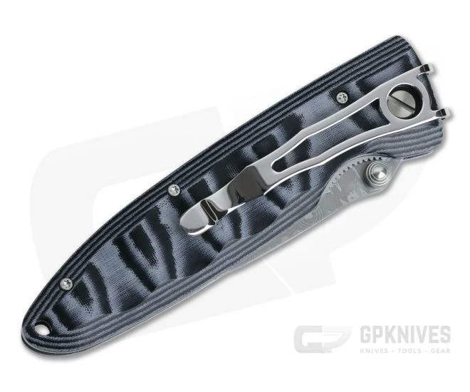 Blade: Made from Damascus Clad VG-10 stainless steel clip point blade of the MC-1 is equipped with a shallow hollow grind for excellent slicing performance and a nearly full length top swedge delivering piercing performance and a fine tip for detail work. The swirling damascus blade adds a classy look to this every day carry folder. The blade opens smoothly on Teflon washers via dual thumb studs which match the satin pivot hardware. The blade is classic, functional and utilitarian.
