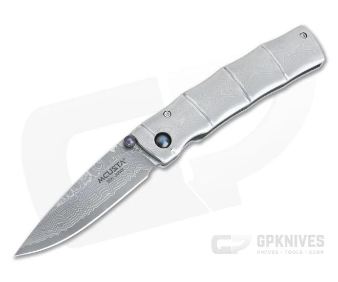 Incorporating elements of a classic Gentleman’s folder while offering the ease of use and performance of modern design and materials, the Take Damascus Bamboo liner lock is part of Mcusta’s Premium Folder Series. Equipped with a Damascus clad San Mai VG10 blade for excellent cutting performance and unparalleled style, the handles are handsome Damascus milled to mimic the look and feel of bamboo. This classy folder is an excellent choice for a gentleman’s every day carry folder.