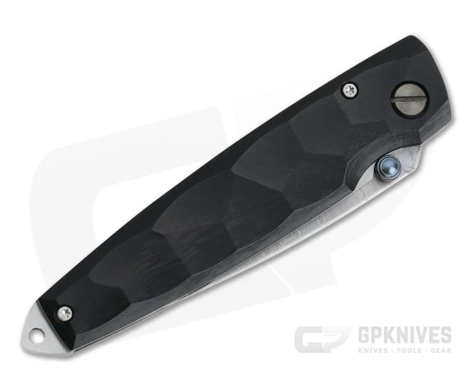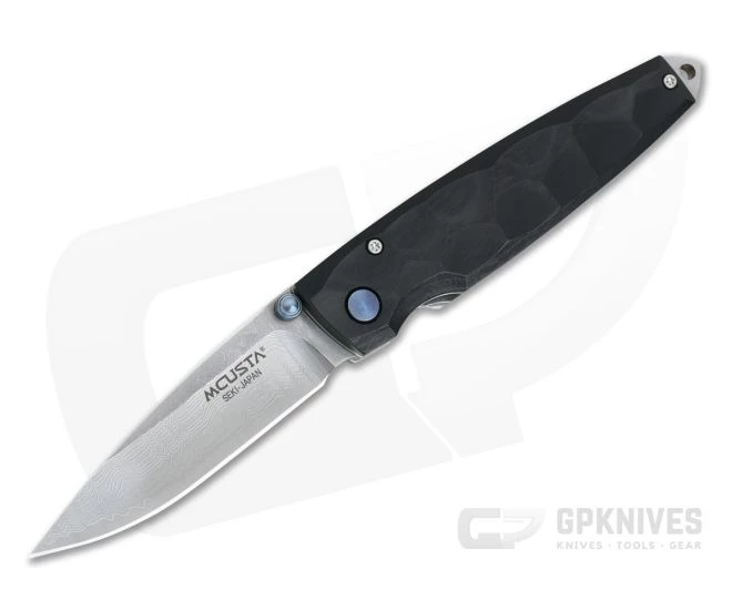 Blade: Made from San Mai, 33 layer nickel Damascus clad VG10 stainless steel, the drop point blade has a shallow hollow grind for excellent slicing and piercing performance while retaining good durability. It opens smoothly on Teflon washers via dual anodized thumb studs. The San Mai clad gives each blade a unique, wavy Hamon design for a striking visual appeal.