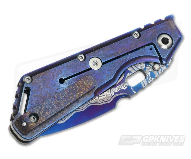 The Blade: Mick crafted this one into a piercing shape with deep belly that offers wicked intimidation and collector appeal. The precision, patience and technique that goes into every blade is absolutely astonishing for a knife lover. This one features an aggressive point with nightmare grinds from some blue dipped, homemade san mai. A long thumb ramp with subdued notching blends into a faux top edge. It operates smoothly via an ambidextrous oval window cutout of the flat with small blade stop protrusions. The choil is signed M. Strider.