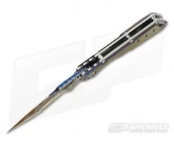 The Handle: Over 5 inches of textured, Magic Mick anodized glorious titanium with carefully grooved edges and textures galore. It’s a spectacular combination of bronze/blues/purples you have to see in person to fully appreciate. It’s that cool. Construction on this beast consists entirely of titanium. Oversized Ti barrel spacers, hardware and internal “closed” blade stop. The pivot bolt construction is now titanium as well. It works in conjunction with thick phosphor bronze washers to create that silky action. The XL also utilizes the Hinderer Lockbar Stabilizer to prevent over-extension of the bar. A 3/4 inch slot is cut from the bottom to allow for lanyard customization.