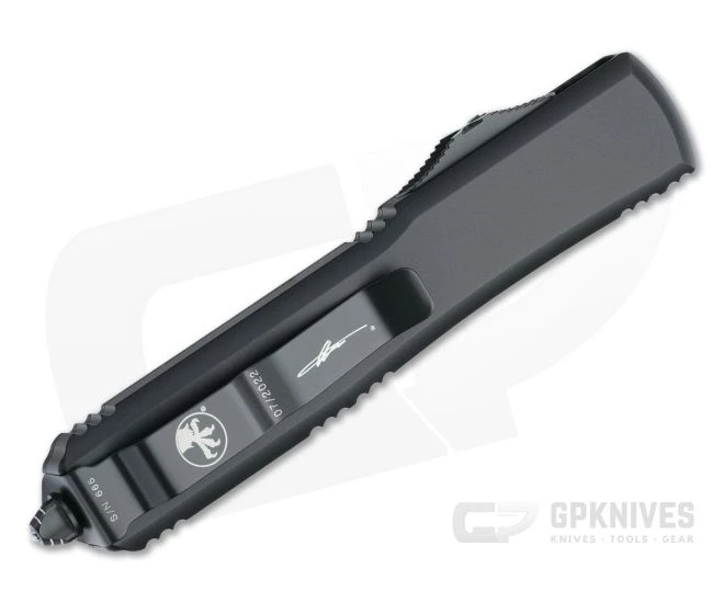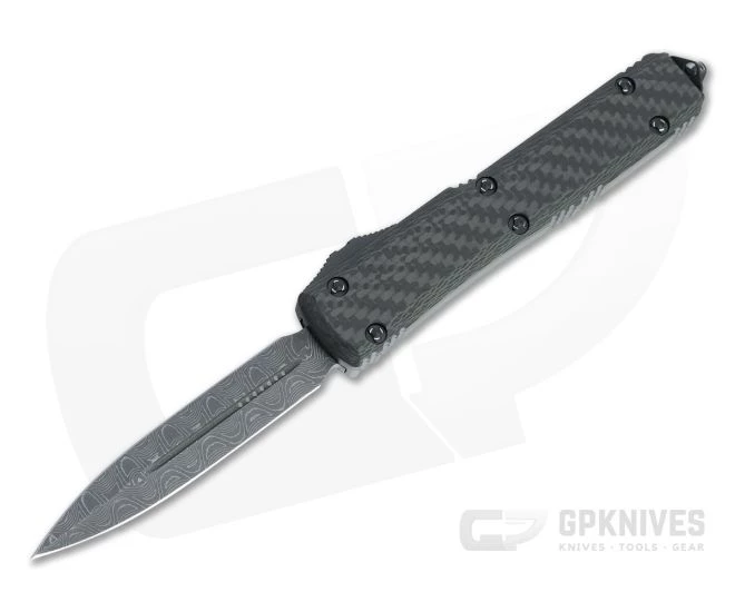 The Ultratech double action out the front automatic knife from Microtech sets the standard for the category. With a sleek yet robust design, precision American made construction and premium materials the Ultratech is a perfect everyday carry companion. Part of the premium Signature Series, this version has a double edge Damascus blade, black aluminum frame with twill carbon fiber top and ring milled hardware.