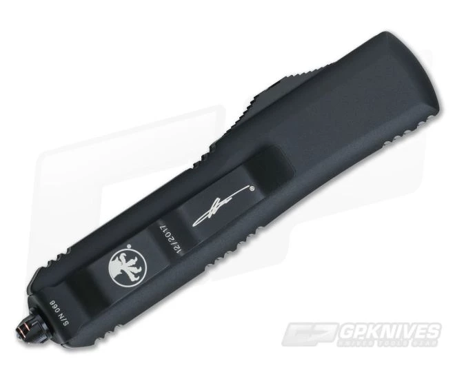 This Signature Series UTX-85 (15% smaller than an Ultratech or 85% the size of one) dual action out the front automatic knife from Microtech makes an even friendlier every day carry option. This version has a Carbon Fiber Topped black contoured handle and classy Damascus Tanto Point-styled blade.