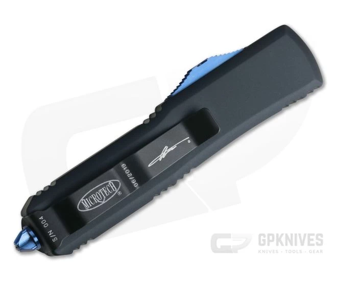 Handle: Smooth, black coated 6061-T6 aluminum has improved rounded edges creating not only a comfortable feel in-hand but a smooth transition in and out of your pocket. There are several areas of machine-grooved texturing around the outsides aiding in grip. This lighter more ergonomic grip is easy on the hands and eyes. The handle’s construction is completed with Microtech’s TI proprietary hardware and glass breaker end, both with a blue anodized finish. The black coated pocket clip is marked with an individual serial number, date of production, signature and logo.