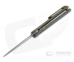 Handle: A simple, tapered and contoured handle is formed from two slabs: striking Raindrop Gold Carbon Fiber for the front scale and bronze anodized solid titanium for the back with a partial stainless steel back spacer for balance. The uncommon gold carbon fiber delivers a classy look paired with the pattern welded Damascus blade while also reducing the weight for carry. Secure in the grip thanks to the distal taper, the handle is quite comfortable in multiple grip positions. Integral to the back slab, the frame lock mechanism is equipped with a steel lock face insert for smooth, reliable operation and rock solid lock up for the life of the knife. Slotted screw construction and a bronze anodized pivot ring round out the construction.