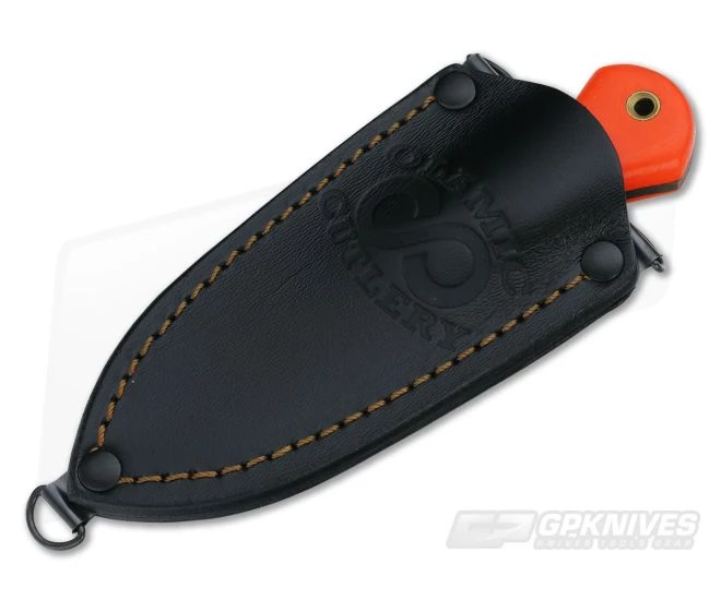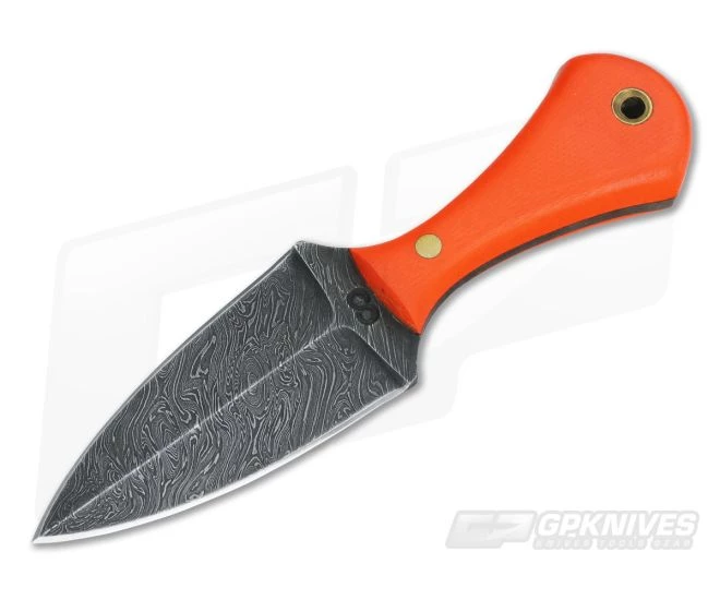 This necker is under five inches overall with full tang damascus construction. Dual edged for sharp, piercing power with pinned orange g10 handle scales. Bright, tough construction this Necker from Olamic would make an excellent companion. Includes a lanyard hole.