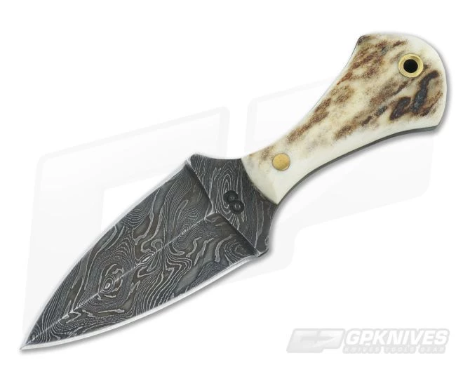 This necker is under five inches overall with full tang damascus construction. Dual edged for sharp, piercing power with pinned natural stag handle scales. Rugged, tough construction this Necker from Olamic would make an excellent companion. Includes a lanyard hole.