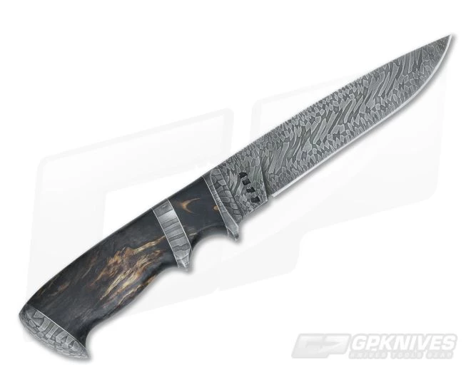 The Olamic Cutlery Suna is an exquisite custom specimen crafted using hand-forged and shaped marbled damascus and eye-catching Karelian Birch Wood handles. Comfortable in hand and well balanced, this beauty not only offers a remarkable appearance but also performs exceptionally as a utility fixed blade.