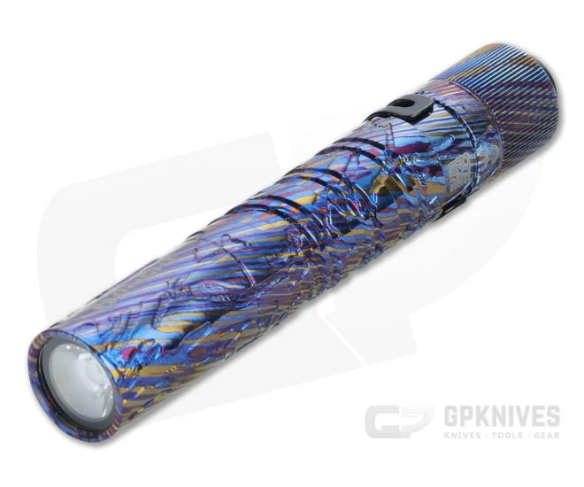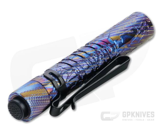 The Olight i3T is a slim, compact LED flashlight that delivers up to 180 lumens of illumination powered by a single AAA battery. The high-performance cool white LED paired with a TIR optic lens produces a soft and balanced beam and delivers a 180-foot beam distance, while the compact size makes for a great every day carry choice. A dual carry pocket clip for attaching to your pocket, gear, or hat for hands-free lighting and the simple tail switch operation cycles modes in both constant and momentary operation. Double helix body knurling offers style and traction in the hand. This limited edition version has a titanium Damascus body.