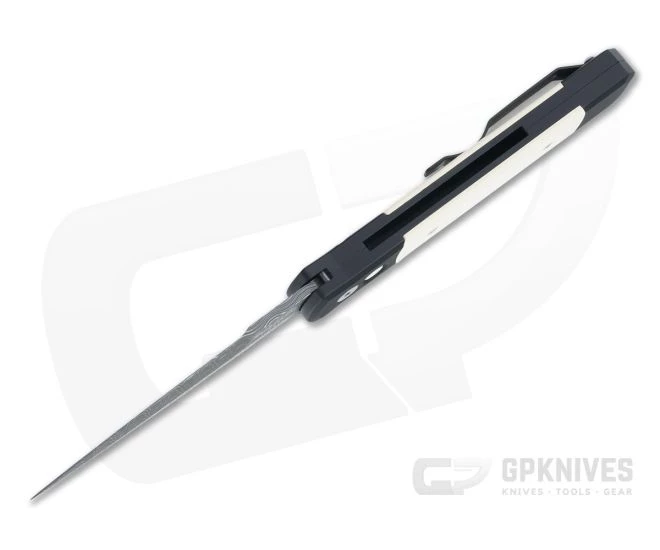 Handle: A contoured, coffin-shaped handle made of black anodized 6061-T6 aluminum provides a comfortable in-hand feel in a variety of grips with smooth deployment from the pocket for use. Dual ivory Micarta inlays deliver the “tuxedo” look and a warmer feel in the hand. The button lock mechanism is smooth in operation and rock solid for reliable security in use. The Micarta inlaid button, pivot, and screws are satin finished.