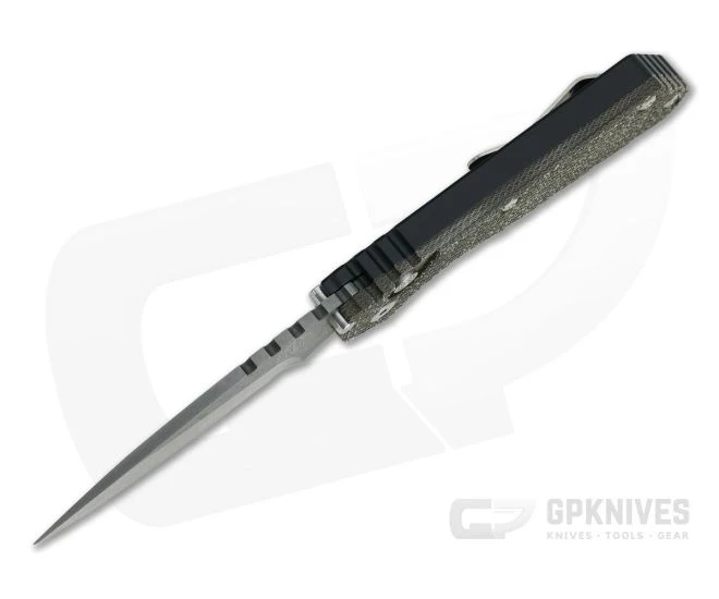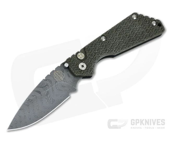 GPKnives has teamed up with Protech to offer an exclusive version of the Protech/Strider SnG, an American made automatic with quality design and high tech production in a highly affordable platform. Black hard anodized 7075 Aluminum is super tough and forms the foundation of the knife, supporting a Green Textured Micarta top and a Chad Nichols “Boomerang” pattern Stainless Damascus blade that delivers a striking look with modern performance. The Pro-Strider SnG auto is a high quality collaboration that brings the best things from the SnG design and Protech’s manufacturing to a single knife. GPK Exclusive with Green Micarta top, available while supplies last!