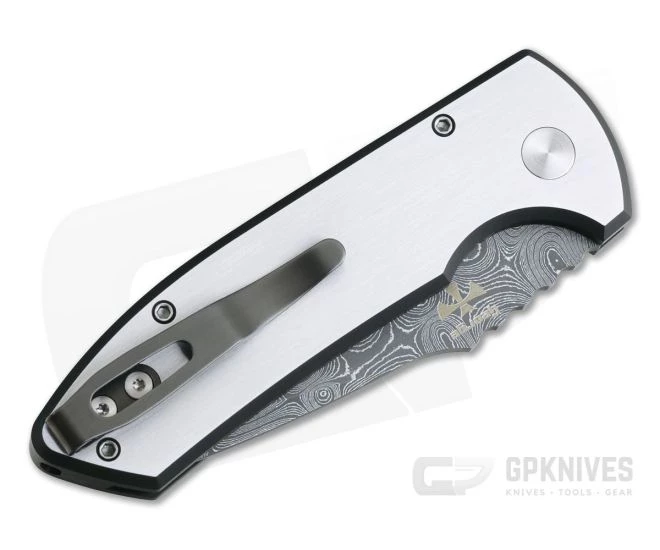 The Protech Knives SBR (Short Bladed Rockeye) is a utilitarian, compact, every-day-carry version of the Les George iconic Rockeye model, retaining the classic design in a smaller package. This Custom Shop SBR has the same American innovations as the Rockeye, featuring modern materials, high tech manufacturing, advanced coil spring mechanism, and quality American production along with some specialized features not found in standard production models. This SBR Custom has an all stainless construction with knurled two-tone finish, Chad Nichols Stainless Damascus blade and Mother of Pearl inlaid push button.