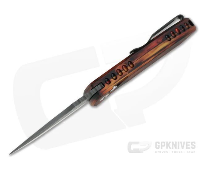 Handle: Compact and ergonomic, the 6061-T6 aluminum handle is lightweight and tough offering comfort in a variety of grips. The smooth handles make for fast deployment while the “Del Fuego” custom finish gives this piece a unique and eye-catching look. Reliable lockup and smooth operation are provided via the straightforward button lock, inlaid with Mother of Pearl for a touch of class. Satin hardware rounds out the construction with “#X of 50” marked on the handle.