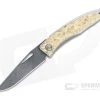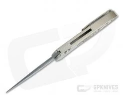 Handle: Two pieces of bronze anodized, titanium come together to form the slimline handle with two-tone finish: satin on the front and back with orange peel texture on the edges. The front is inlaid with a piece of stunning presentation grade tiger coral while the interior of the handle slabs are engine turned from a truly custom touch. Simple and elegant the handle feels secure and comfortable in the hand with an added heft from the titanium construction. Flawless in operation, the button lock mechanism delivers reliable, rock solid lockup for secure use and inlaid with a mosiac pin. Includes hard wood display box.