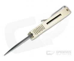 Blade: The modified Wharncliffe blade has a high saber grind and fine tip that excels at detail work while being able to handle a majority of daily cutting tasks. Coil spring automatic deployment is fast and reliable via the mosaic pin inlaid button which elevates this custom piece along with the striking Nichols Damascus blade steel.