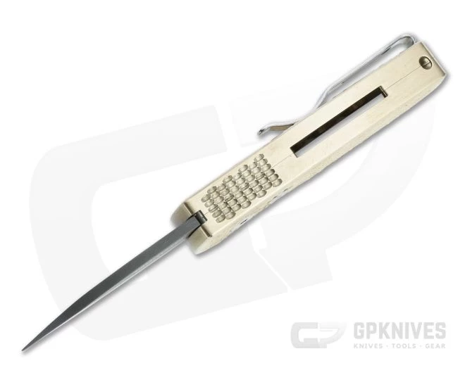 Handle: Made of solid bronze AL the handle is robust and hand filling. Bronze aluminum is a premium alloy that delivers solid heft in the hand and will develop a unique natural patina with time and handling, though slower than standard bronze. A subtle choil, tapered end and dimpled spine jimping pair with the textured milling on the flats for a secure grip and an appealing bright finish complemented by satin chamfers and edges. The button lock is smooth, solid, and secure for safe operation.