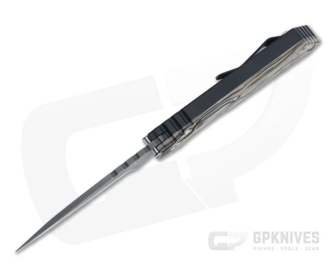 Strider Knives and Protech have teamed up to deliver an American made automatic version of the iconic SnG folder. Protech provides high-tech American production for affordability, performance, and precision construction. The Pro-Strider SnG auto is a high quality collaboration, bringing the best features from the SnG design and Protech’s manufacturing to a single knife. This premium version comes with a Chad Nichols stainless “Virus” Damascus blade, camo G10 top and mother-of-pearl inlaid push button. One of a 50 piece run.