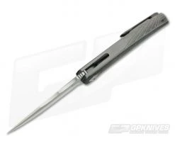 Handle: Milled from a solid slab of titanium the integral handle design delivers a clean look and enhanced strength. The titanium also forms the integral frame lock mechanism that delivers reliable lock up and smooth operation thanks to the hardened steel lock face insert. The sweeping spine transitions from a flat section near the pivot to a crosshatch milled contour near the end for exceptional ergonomics. Marbled carbon fiber inlays and Damasteel pivot colors bring the JACK to the next level of style. The titanium has a bead blast matte grey finish.