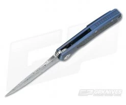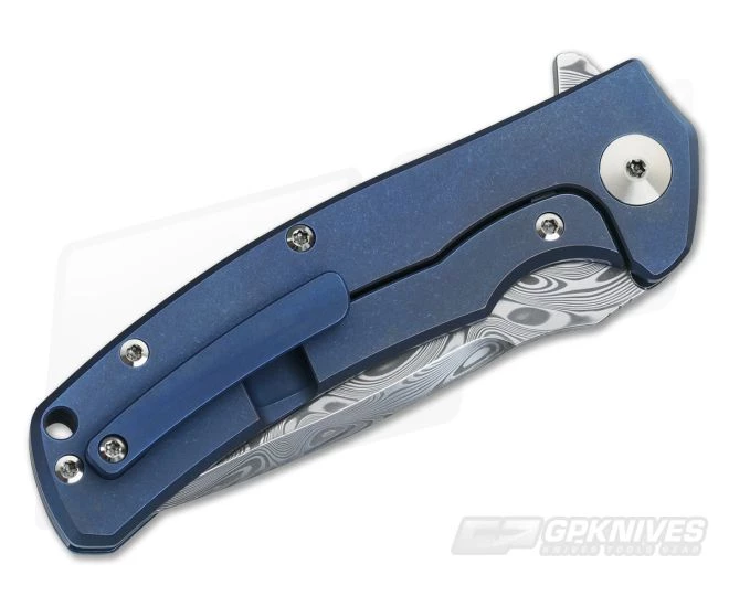 The Handle: The Mini Horizon D has a precision 3D machined titanium frame lock construction. A replaceable hardened steel lock face insert gives smooth and reliable lock operation and also acts as over-travel prevention. Internal milling of the titanium handles reduces weight and gives the knife excellent balance in hand. The contoured handle has a handsome Blue Anodized finish with an classy carbon fiber inlay that provides a high-end look and feel to this folder. The pocket clip is set up for right hand, tip-up only carry.