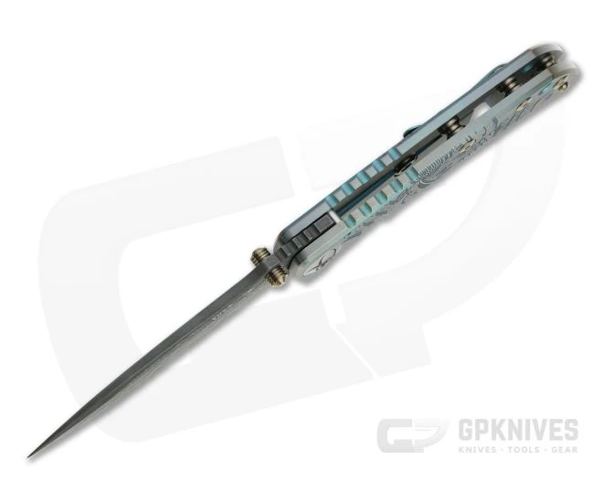 Blade: A classic, utilitarian drop point blade is made from Nichols stainless Damascus with a top swedge and high saber grind for balanced performance and durability. Acid etched to bring out the unique look of the pattern welded steel, the blade offers an eye-catching look with modern performance. Riding on reliable bronze washers the blade deploys fast and smooth via dual titanium thumb studs. Aggressive jimping on the thumb ramp offers added traction and a point for indexing.