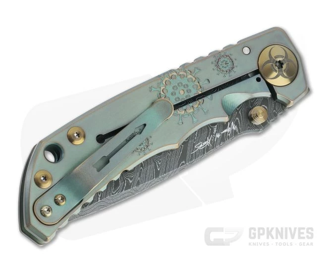 Winner of the “Overall American Made Knife of the Year” for 2016, the Spartan Harsey Folder is now available in a special edition “The Plague Doctor” graphic. This collaborative effort features Bill Harsey’s signature styling combined with premium materials and Spartan’s precision fit and finish. Comfortable in-hand and ready for hard use this version features a Nichols Damascus blade, anodized titanium handles and deep, elaborate engravings: “Do not fear my dear” banners framing a classic plague doctor figure on the front and virus particles on the back with bronze biohazard engraved domed pivot hardware. Listing is for item pictured.
