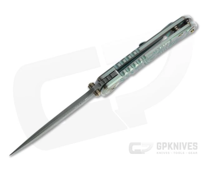 Blade: A classic, utilitarian drop point blade is made from Nichols stainless Damascus with a top swedge and high saber grind for balanced performance and durability. Acid etched to bring out the unique look of the pattern welded steel, the blade offers an eye-catching look with modern performance. Riding on rugged bronze washers the blade deploys fast and smooth via dual titanium thumb studs. Aggressive jimping on the thumb ramp offers added traction and a point for indexing.