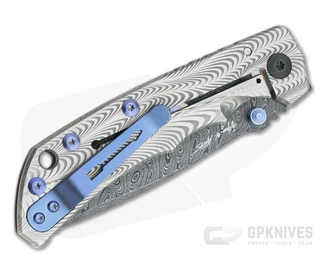 Handle: Ergonomic handles have been constructed from satin finished 6AL4V titanium with laser engraved sound wave pattern on both front and back. A combination of blue anodized and black PVD coated hardware complete the construction. The back titanium slab forms an integral frame lock mechanism for reliable lock-up in hard use conditions with internal lock-bar stabilizer.