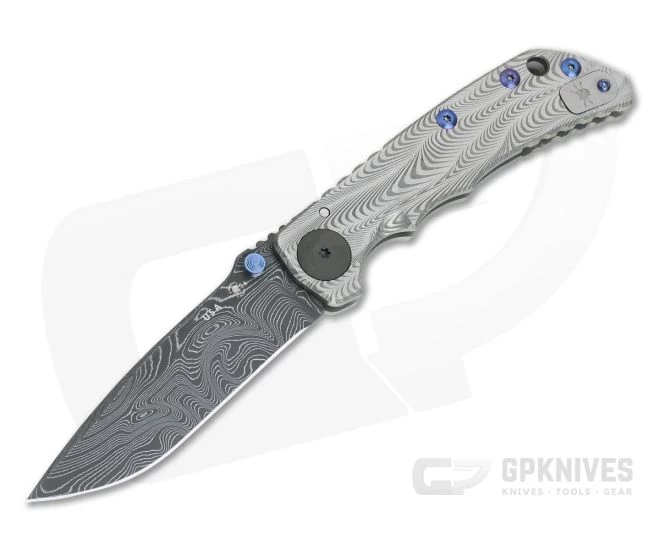Blade: A traditional drop point style blade has dual titanium thumb studs making opening from either side a breeze. Bronze washers construction at pivot delivers smooth operation of the blade with zero play. Chad Nichols Stainless Damascus steel delivers modern performance with a striking and unique visual appeal for this custom, tactical folder. Jimping along the thumb ramp adds traction for serious use.