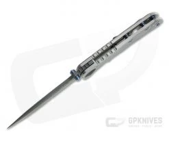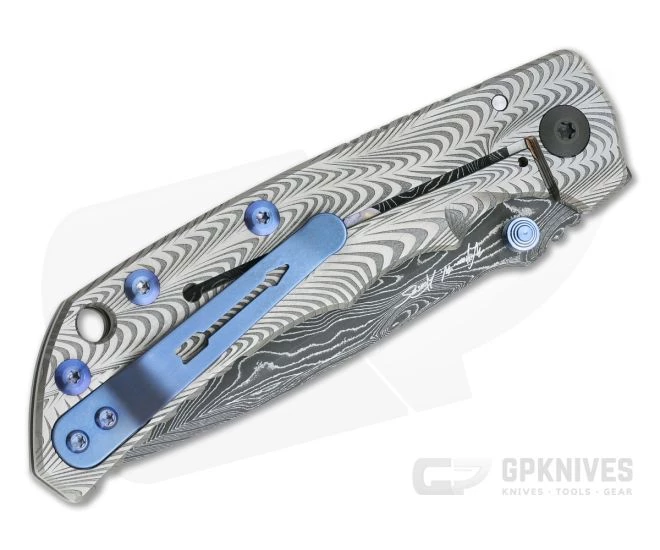Handle: Ergonomic handles have been constructed from satin finished 6AL4V titanium with laser engraved sound wave pattern on both front and back. A combination of blue anodized and black PVD coated hardware complete the construction. The back titanium slab forms an integral frame lock mechanism for reliable lock-up in hard use conditions with internal lock-bar stabilizer.